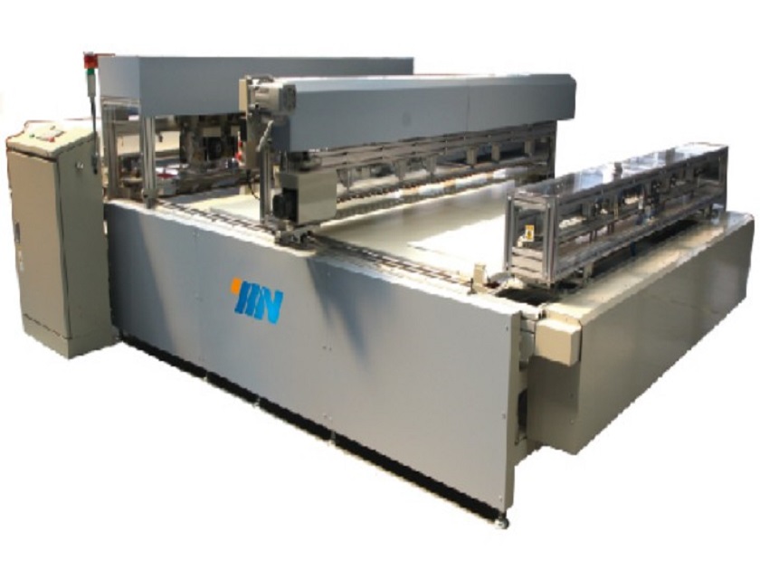 ■ 可通過自動對邊裝置與獨立放布裝置,在寬度方向進行5個裁剪機頭同時裁剪,并根據(jù)指定的長度進行定寸裁剪,最后在自動升降臺板上進行自動疊層作業(yè)。最大疊層高并可達到400mm;